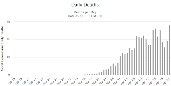 The coronavirus remains the No. 1 cause of death in America on a day-to-day basis, clocking in at 2,804 deaths just today. Total deaths in the USA will exceed 46,000 tomorrow, confirming our earlier projection that estimated 46,000 to 93,000 deaths from coronavirus in the USA by the end of July. It’s not even the end of April, and we’re already beyond 45,000. (At the time we made the projection, it was dismissed as “crazy” by the very same people who still claim the coronavirus is “no worse than the flu.” Those are the people who can’t do math.)
