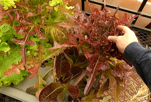 The video today is especially astonishing. This is a lettuce bin that I almost forgot about. I added water perhaps once a week, and after the initial nutrients from the very start, I added no nutrients whatsoever. And yet the results are amazing. Check out this photo of the red oak leaf lettuce: