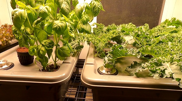 If you need to grow indoors, you can use artificial lights. Here’s a photo of the amazing results we’re getting with basil, lettuce, kale, chard and other crops, and the only electricity used here is for the lights (which are very efficient and low-cost). By my calculations, each bin is costing less than 20 cents per day in terms of electricity: