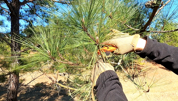 So I spent part of the day harvesting pine needles (with permission) from several pine trees. I only snip a small amount from each tree because I respect the trees and want them to keep producing: