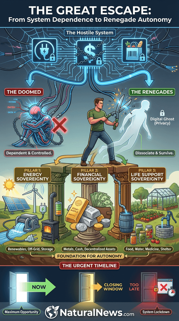 Your mission is clear and time-sensitive. You must complete the transition from system-dependence to full renegade autonomy before the final locks engage — before CBDCs mandate all spending, before digital IDs are required for all movement, before the grid is weaponized to punish dissent. The window is closing. This is a war for your existence, for your family’s existence, and for the very concept of free human life. Start today. Dissociate. Decentralize. Disappear from their grid. Your survival depends on it.